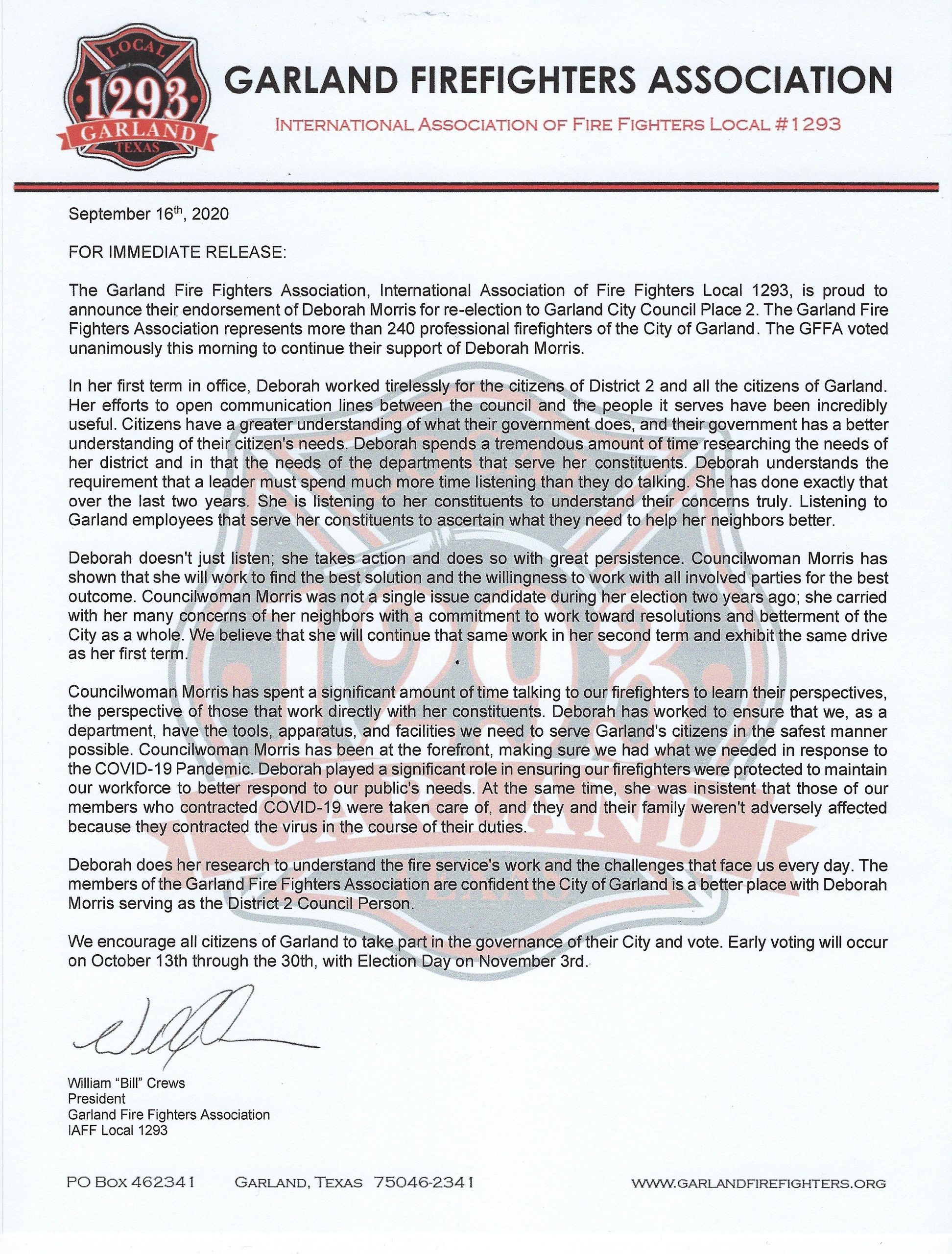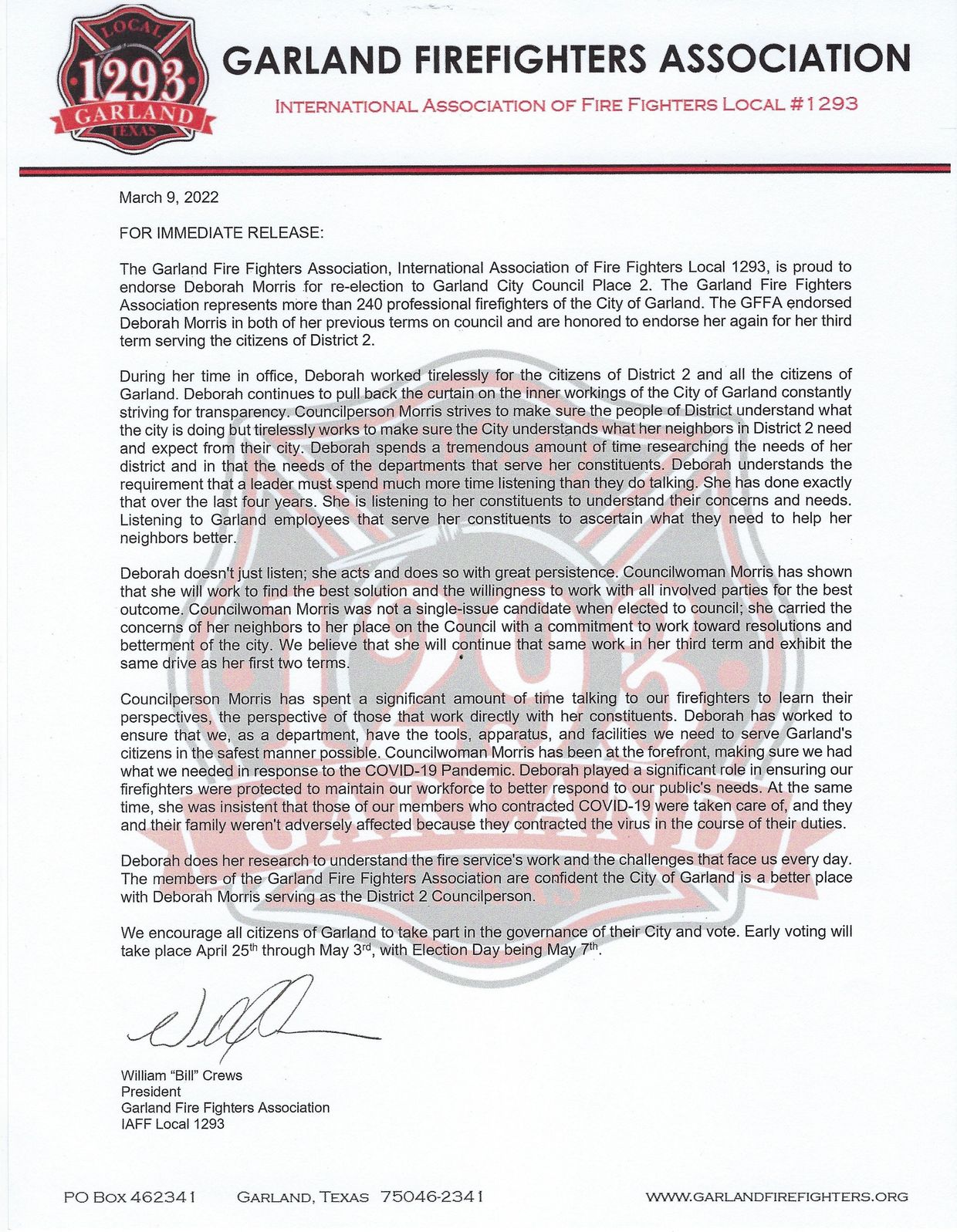 "Join me in voting for and or supporting the re-election of Councilwoman Deborah Morris for another term as our District 2 Representative on the Garland City Council. Councilwoman Morris is the most qualified candidate with proven leadership."